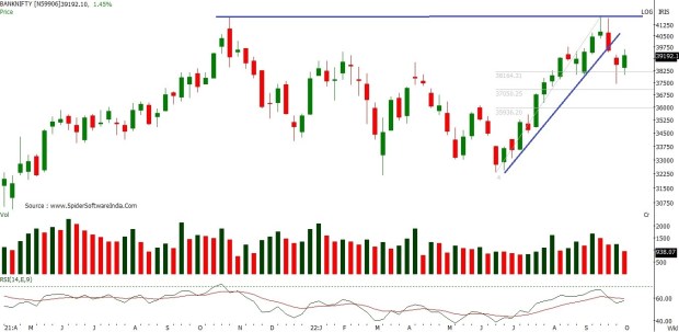 Bank Nifty started the week with a downward gap and buying momentum led it close on a positive note. Bank Nifty closed at 39178 with a gain of 546 points on a weekly basis. On the weekly chart the index has formed a small Bullish candle with shadows on either side indicating indecisiveness amongst participants regarding the direction.