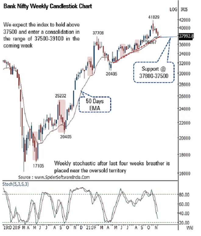 - The Bank Nifty declined for the second consecutive week and closed down by 2%. The weekly price action formed a bear candle as the index after last four weeks’ corrective decline is currently testing the crucial support area of 37800. Consequently, the daily and weekly stochastic oscillators also noticeably cooled off to approach oversold trajectory with a reading below 25