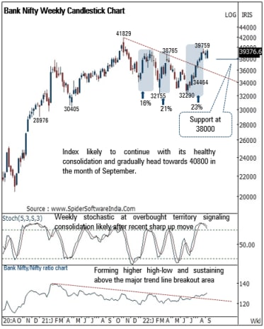 Going ahead we expect the index to continue with its healthy consolidation and gradually head towards 40800 in the month of September. In the coming week it is likely to consolidate in the broad range of 39800-38000 with PSU banking stocks continuing with its outperformance. Consequently, this will help the index to cool off overbought conditions (currently weekly stochastic cooled off to 82 from recent high of 95)
