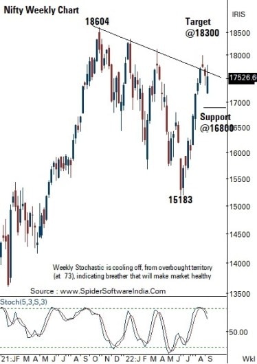 The prolongation of consolidation would make the market healthy by cooling off overbought conditions (currently weekly stochastic cooled off to 73 from the previous week’s reading of 87). We retain the support base at 16800 as it is 50% retracement of July-August rally (15858-17992) and value of rising 200-day EMA at 16741