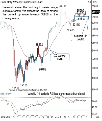 – The weekly price action formed a strong bull candle with a higher high-low signalling resumption of up move as the index generated a breakout above the last eight weeks’ consolidation range (35800-34000).