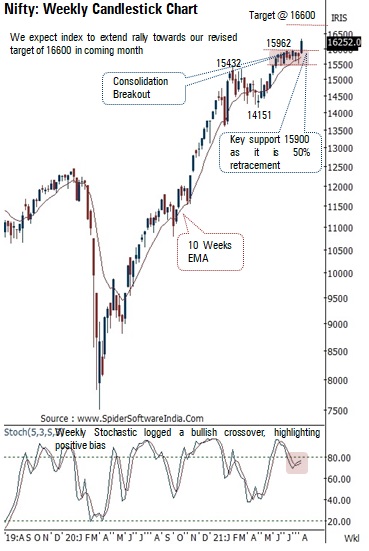 – On expected lines, Nifty logged a resolute breakout from two months consolidation (15950-15500) and achieved our earmarked target of 16300. The weekly price action formed a sizable bull candle carrying higher high-low, indicating acceleration of upward momentum that augurs well for next leg of up move