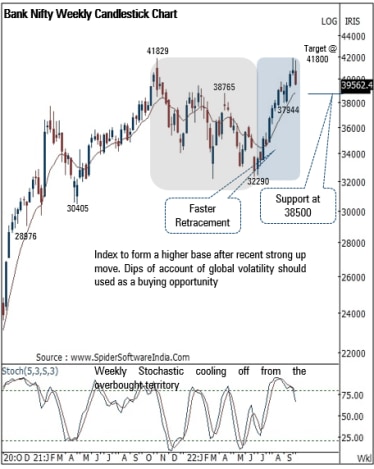 The last two week’s breather has helped the index to cool off the overbought condition in the weekly stochastic from the reading of 95 to 67. We believe temporary breather after the recent strong outperformance will make the overall trend healthier. The index has support around 38500 levels as it is the confluence of the 50 days EMA (currently placed at 38790) and the 80% retracement of the last three weeks up move (37944-41840).
