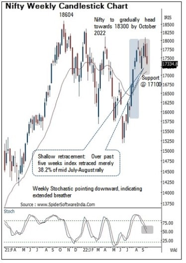 NSE Nifty 50 witnessed a roller coaster ride as it oscillated by 1200 points over the last week. Consequently, weekly price action formed a bear candle with a shadow on upper side, indicating profit booking at higher levels. On the structural front, our positive stance remains intact with a target of 18300 in October 2022 while 17100, which is August low, is expected to act as key support. During this monthly expiry week, possibility of extended consolidation in the 17800-17100 range with a stock specific action cannot be ruled out ahead of RBI policy. Thus, dips should be utilized to accumulate quality stocks.