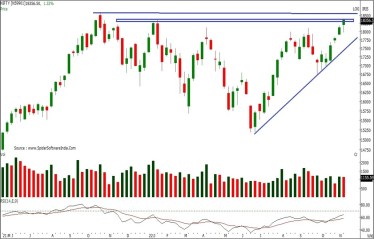 The chart pattern suggests that if Bank Nifty crosses and sustains above 42350 levels it would witness buying which would lead the index towards 42500-42800 levels. However if index breaks below 42000 level it would witness selling which would take the index towards 41750-41500. For the week, we expect Bank Nifty to trade in the range of 42800-41500 with positive bias. The weekly strength indicator RSI and momentum oscillator Stochastic have both turned positive and are above their respective reference lines indicating positive bias.