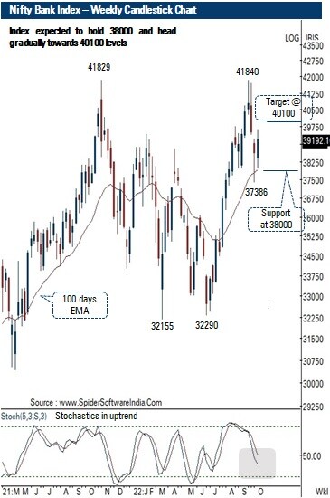 The Bank Nifty has key immediate support at 38000 mark being the last week’s low that also coincides with rising 100 day EMA.