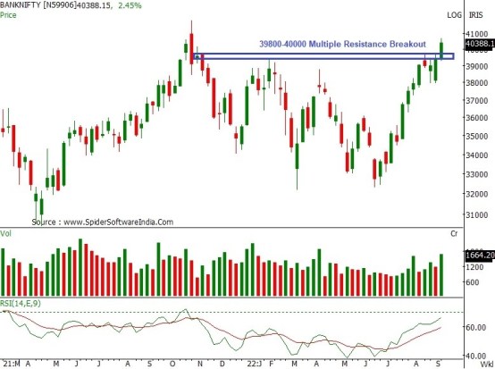 The chart pattern suggests that if Bank Nifty crosses and sustains above 40700 level it would witness buying which would lead the index towards 41200-42000 levels. However if index breaks below 40000 level it would witness selling which would take the index towards 39500-39000. For the week, we expect Bank Nifty to trade in the range of 42000-39500 with a positive bias. The daily and weekly strength indicator RSI is moving upwards and is quoting above its reference line indicating positive bias.