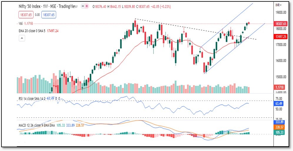 On a daily chart formed Bullish candlestick, indicates a positive structure in the market. On the weekly scale, Nifty made a Bullish candle and manage to close above the previous swing high which points out a positive setup in the market. In addition, the Technical indicator Ichimoku cloud suggests that the price is trading above the cloud which, now acting as a support for the market. On the momentum front, the MACD histogram is hovering in the positive territory with an inclining trajectory that point to The Relative Strength Index RSI (14) on the daily chart is 63 marks. The upside resistance is placed near the 18600 and18800 levels. Support exists at 18150 to 17950 levels.
