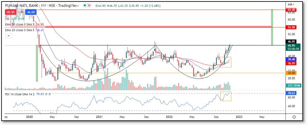The PSE sector and banks are outperforming benchmark indices, which will add more strength to the stock. The Exponential Moving Averages have witnessed a Golden crossover and the price has strongly settled above its 20 & 50 – EMA which is placed at 38.40 & 36.90 levels respectively. The RSI (14) has also trading above 70 levels confirming bullish strength.