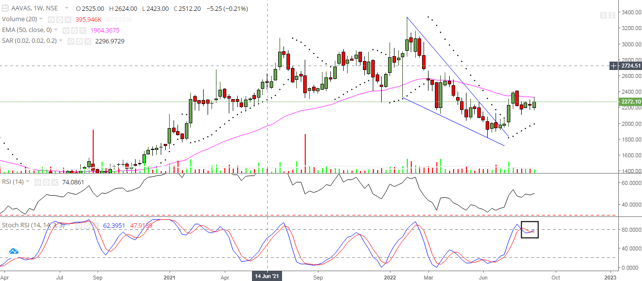 Moreover, after a breakout of Falling Wedge, the price has been consolidating & builds up just below the 50 Exponential Moving Averages, which indicates bullish strength in AAVAS. Furthermore, the RSI (14) indicator has also sustained above 50 levels & an oscillator Stochastic RSI is also supportive for the long position with positive crossover. Hence, based on the above technical structure one can initiate a long position in AAVAS at CMP 2272, or a fall in the price to 2280 levels can be used as buying opportunity for the upside target of 2475. However, the bullish view will be negated if the price closes below the support level of 2230.