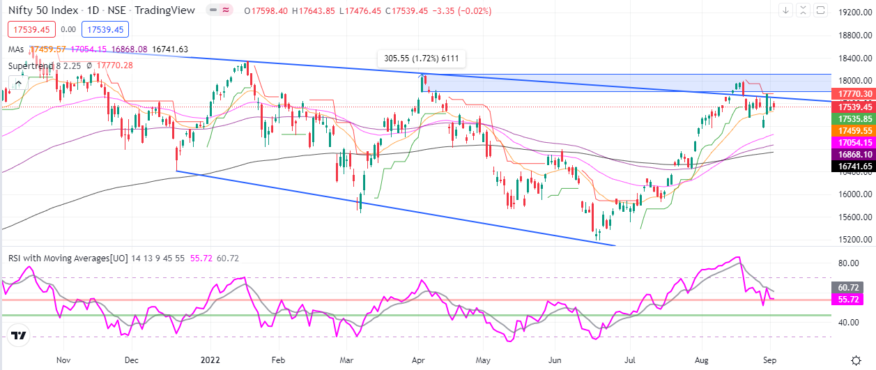 The Nifty has seen a sharp sell-off from the levels of 17992. There were three days sell-off of till 17345. Post that there was pullback till 17726 which also got sold off till 17166. It is the first indication of resistance in place near 18000 levels and any bounce below 18000 levels can be utilized to go short. On the last day of the week, the market witnessed a sell-off in closing hours. It is a clear indication of the current bear market rally has come to halt. As far as RSI(14) and 9 EMA the same is started moving below 70 levels. The super trend (8,2.25) is also shifted above the current bars. So, there are multiple indications that the bears may take charge very soon.