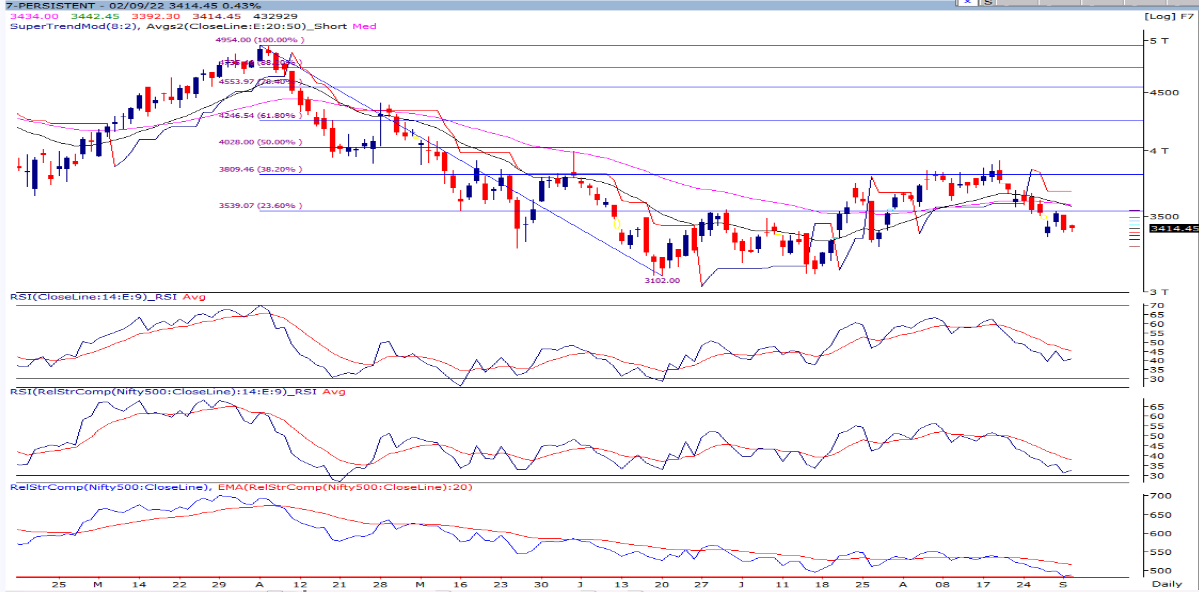 Persistent managed to retrace only 38.20% of the last downside move from the top of 4954 in May 2022. After that, it is resuming a downward trend. While moving downwards it has given a death cross in 50 and 20 EMA. Which is bearish. The slop of 50 EMA has flattish and 20 EMA is started sloping downwards. Both of these moving averages have converged and are ready to get diverge in the coming few days. The RSI (Relative Strength Index) is quoting 39.90 levels and it is below EMA. The REC with Nifty is also indicating bearishness. On the downside, levels of 3106 will act as support. Whereas, on the higher side 3620 should work as strong resistance. One should keep stopping above 3620 and sell the persistent future for the target of the recent low.