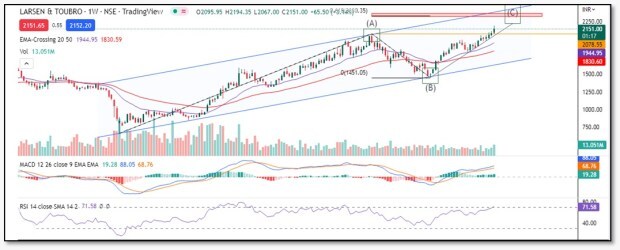 Recently, the price has given a breakout of a 52-week high level (2078.55) after the golden crossover of EMA. On the momentum front, the MACD histogram is hovering in the positive territory with an inclining trajectory that points to a strong momentum. The momentum indicator RSI (14) has crossed 70 marks confirming the internal strength. Hence, based on the above technical structure we are expecting bullish movement for the week ahead. On the downside, it may find support around 2075 while upside resistance is intact at 2350.
