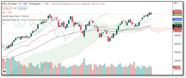 In addition, the Technical indicator Ichimoku cloud suggests that the price is trading above the baseline, which is now acting as a support for the market. The momentum indicator Relative Strength Index RSI (14) has also sustained above 63, indicating bullish strength. The upside resistance is placed near the 18750 & 18900 levels. Support exists at 18350 to 18200 levels.