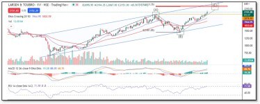 Since March 2022, the stock has been rising continuously in the upward channel with Higher Highs and Higher Lows formation. The price has taken support from the 50% Fib retracement level of the last Impulsive wave and settled just above the 20 & 50 Exponential Moving Averages, indicating the presence of strong price momentum. As per the Elliott wave’s analysis, the price has completed its second corrective wave, and moving toward the third impulsive wave indicates the trend may continue in near future.