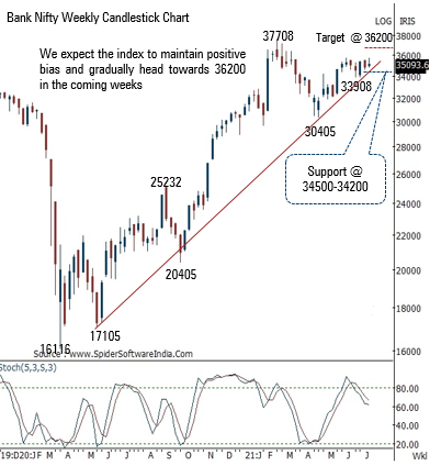 – The Index started the week on a positive note but profit booking at the higher band of the last five weeks range (35800-34000) saw the index gave up most of its weekly gains and closed marginally higher by 0.8%. The weekly price action resulted in a small bull candle with a long upper shadow while maintaining higher high-lows indicating extended consolidation