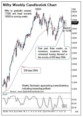 Going forward, we expect Nifty to gradually surpass the upper band of consolidation placed at 17500 levels in a non-linear fashion and eventually head towards 18000 in coming weeks, amid onset of Q2FY23 earnings and festive season. Key point to highlight is that, over the past six weeks, on numerous occasions index witnessed buying demand in the vicinity of 200 days EMA placed at 16900, thereby rewarding buying on dips strategy amid global volatility. We maintain our stance of buying dips as we expect 16700 to be held. Our positive view on the market is based on following observations:
