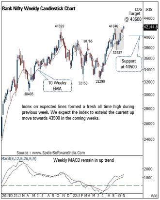 The index during last week has generated a breakout above the last eight weeks range (41840-37387) signaling extension of the up move. Going forward, we expect the index to gradually head towards 43500 levels in the coming weeks being the 138.2% external retracement of the recent breather (41840-37386). Hence, any dips should be used as an incremental buying opportunity in quality banking stocks