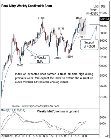 The Bank Nifty continued with its positive momentum to gain for the sixth consecutive week. The index on expected lines surpassed its previous all-time high and closed the week at 42137 levels higher by 2.1%. PSU banking stocks continue to outperform with the PSU bank index closed the week higher by 6%. The weekly price action formed a bull candle with a higher high-low signaling continuation of the of the positive momentum