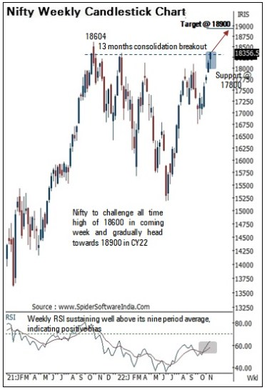 We expect, Nifty to challenge its all time high of 18600 this week and gradually head towards 18900 by December 2022. The formation of higher peak and trough on the larger degree chart supported by multi sector participation makes us reiterate our constructive stance. Thus, temporary breathers from here on should be capitalized as an incremental buying opportunity as we do not expect the index to breach the key support of 17800. Our positive stance on the market is based on following observations: