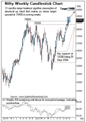 The breakout from 13 months’ range supported by across sector participation signifies resumption of structural up trend that makes us reiterate our constructive stance and expect Nifty to gradually head towards 19400 in coming weeks. However, the move towards 19400 would be in a non linear manner as bouts of volatility amid global development can not be ruled out wherein we expect broader market to relatively outperform as it is resolving out of three months’ higher base formation. Thus, dips should be capitalised on as incremental buying opportunity as we expect any temporary breather to get anchored around key support of 18300. The aforementioned positive stance is further validated by following observations: