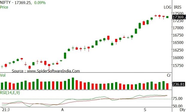 Nifty closed at 17369 with a gain of 16 points. On the daily chart index has formed a bullish candle however it remained restricted within the previous session’s High-Low range indicating the absence of strength on either side. The index is moving in a Higher Top and Higher Bottom formation on the daily chart indicating a sustained up trend. The chart pattern suggests that if Nifty crosses and sustains above 17400 level it would witness buying which would lead the index towards 17500-17600 levels.