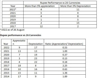 If we look at the performance of the Rupee versus major trading partner countries’ currencies, we find it gained only eight out of 26 countries. A deep dive into the data suggests the rupee has depreciated more than 5% against 11 currencies and 42%, the biggest drop after 2018 when it fell against 15 currencies and 58%.