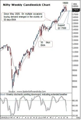 – Structurally, the formation of higher peak and trough on the larger degree chart signifies robust price structure that makes us believe that ongoing breather would find its feet around 17500 as it is confluence of: