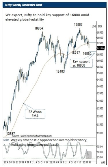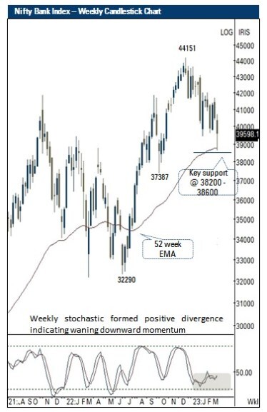 The index has approached key support of 16800 amid oversold conditions (daily and weekly stochastic is placed at 19 and 25, respectively). Further, it has witnessed a follow-through to Thursday’s Doji-like candle at the key support of 16800, indicating abating downward momentum. In this eventful week, volatility would remain high wherein we expect the extended correction to get arrested around the key support zone of 16800 while sustainability above the immediate hurdle of 17200 would pave way for a meaningful pullback towards 17600 by the end of March 2023, as it is a confluence of 200 days EMA coincided with current week’s high. Thus, traders should refrain from creating aggressive short positions.