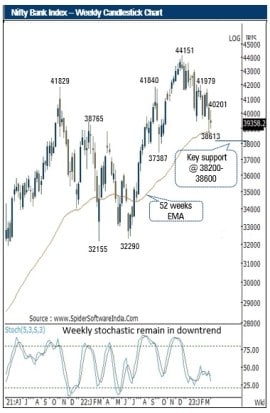 - The index has key support at 38200-38600 levels being the confluence of (a) rising 52-week ema and (b) 80% retracement of June-December 2022 up move (37387-44151)
