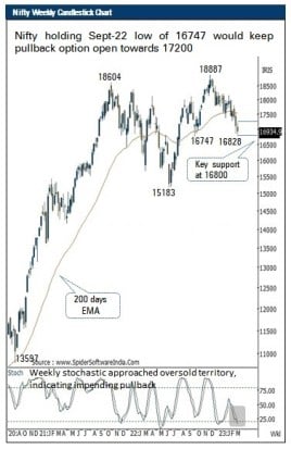 - In the upcoming truncated week, holding September 2022 low of 16747 would keep pullback option open towards upper band of consolidation placed at 17200. Subsequently, a decisive close above 17200 would revive upward momentum and fuel the acceleration in ongoing pullback rally towards 200 days EMA placed at 17500. Thus, 17200 would be the key level to watch as it is confluence of last week’s high 17207 coincided with 20 days EMA. We believe, index is undergoing time-wise correction amid oversold conditions. Thus, traders should refrain from creating aggressive short positions, instead look for accumulating quality large caps in a staggered manner as it is a good time to construct portfolio from medium term perspective. Key monitorable for the coming expiry week are:
