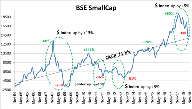 - Every time when the dollar index rallied, there was a big crash in small cap index, be it 2008, 2011, 2013 or now in 2018. All big fall in small cap index has been accompanied by spike in dollar index.