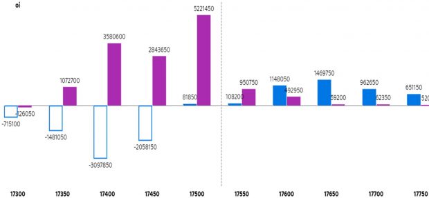 Nifty Put options OI distribution shows that 17,400 has highest OI concentration followed by 17,500 & 17,300 which may act as support for current expiry and on the Call front 17,500 followed by 17,600 witnessed significant OI concentration and may act as resistance for the current expiry.