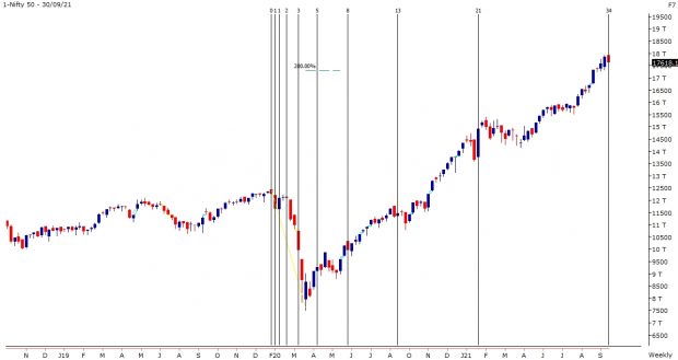 In the last couple of sessions of the monthly expiry, the benchmark index remained in a tight range with some hint of profit booking towards the fag end of Thursday’s session. Although this week so far, Nifty came off a bit from all-time highs, the September expiry panned out extremely well for the bulls as they added nearly 6% to their kitty. Honestly, for the second half of this September month, we maintained a cautious stance on the market and it moved much more than we had expected. In such a strong bull run, it may not be wise to stay with the cautious stance; but the kind of time-projections and negative divergence in momentum oscillators we are observing, we would continue with the same.