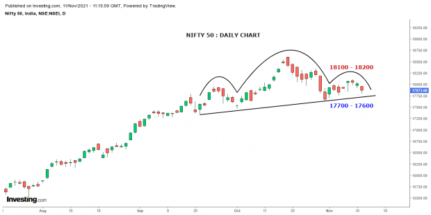 The market was quiet in the last couple of sessions as it was trapped in a slender range. On Thursday, it finally had some action but unfortunately, it was dominated by the bears for the most part of the day. Percentage-wise, it was not even a percent cut on a closing basis; but the more it fails to surpass 18100 – 18200, the harder it becomes for the bulls to maintain their grip on the market. In fact, it would be too early to comment on it; but we can clearly see a bearish formation of ‘Head and Shoulder’ being in process on the daily chart of Nifty. The neckline support is around 17700 – 17600, which if gets broken, we could see difficult days for the market in the short run. With reference to our recent cautious stance on the market, we will not be surprised to see it breaking in the forthcoming week itself.