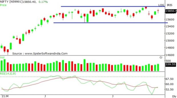 Last week Nifty ended on a flat note, closing at 15856 with a loss of 67 points on a weekly basis. On the weekly chart the index has formed a Bullish candle with a long lower shadow indicating buying at lower levels. Nifty has formed lower high low formation on weekly chart. On the daily chart Nifty has formed Doji Candle which indicates indecisiveness amongst the participants, the index is consolidating within the range of 15600 – 15900 since last 6-7 weeks indicating sideways trend.