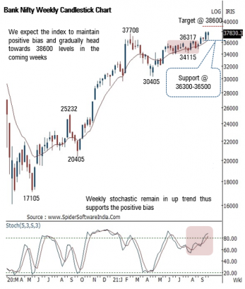 – Going ahead, we expect the index to maintain positive bias and gradually head towards our target of 38600 in the coming weeks as it is the price parity with the previous two major up move of July (34115-36317) and August (34817-37140) each measuring roughly 2250 points added to the recent low of 36327 signals upside towards 38600 levels