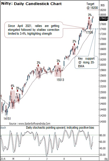 a) The rallies are getting elongated followed by shallow corrections as intermediate corrections have been arresting within 3-4% since April 2021, highlighting robust price structure