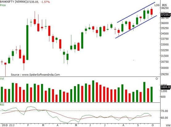 In Bank Nifty the highest OI on the CALL side in the weekly expiry on 7th October is at 38,000(15.16L), 37,500 ( 10.85L) & 38,500(9.70L) strike; while on the PUT side highest OI is at 37,000(10.97L) & 36,000(7.80) strike, with 37,000 acting as a pivotal level for the expiry as there has been addition of 4.84 lakh shares on CALL side & 6 lakh addition on PUT side suggesting that any sustain move on either side of this level will decide the trend in Bank Nifty. While on the writing front 38,000 Call has seen writing of 4.83 lakh shares followed by 38,500 Call writing 4.37 lakh shares indicating a strong resistance zone, while strong support will be seen at 36400 & 36000 as Put writers have been active at this strike.