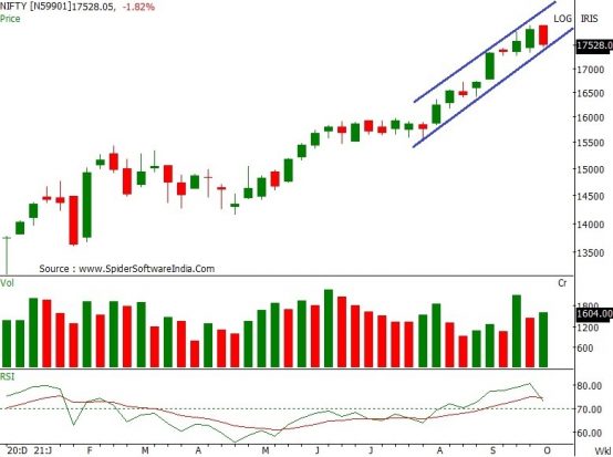 Nifty concluded September expiry on a lower note at 75% compared to 84% in August, shedding around 9 lakh shares in OI indicating some profit booking at higher levels. In Bank Nifty September rolls were marginally higher at 81% vis-a-vis 79% of August expiry adding 6.40 lakh shares in OI. India Vix, indicator of market volatility, has moved up from its recent lower levels of 11-13 to currently at 17.21 suggesting a sense of apprehension as Nifty faced profit booking at higher levels; however as ease off from current levels will augment for an up move in Nifty. Nifty on Friday in October series closed with a cut of 93 points (-0.53%) & OI addition of 3.66 lakh (3.14%) shares in OI indicating Short Build up, while Bank Nifty witnessed Long Unwinding with price cut of 263 points(-0.70) with OI shedding of 0.70 lakh (-3.36%) shares.