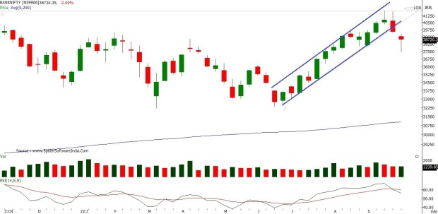 On the weekly chart, Bank Nifty index has formed a Bearish candle with a long lower shadow indicating buying at lower levels. The chart pattern suggests that if Bank Nifty crosses and sustains above 39000 level it would witness buying which would lead the index towards 39300-39700 levels. However if index breaks below 38250 level it would witness selling which would take the index towards 37800-37300. For the week, we expect Bank Nifty to trade in the range of 39700-37300 with mixed bias. Weekly RSI  is quoting below its reference line indicating negative bias in the short term. However the daily RSI is in positive terrain and sustaining above the reference line which indicates short term pullback.
