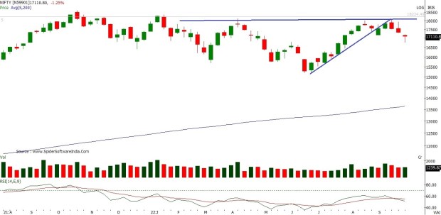 Traders can initiate a Moderately Bullish strategy with reduced premium outflow & lower breakeven point called BULL CALL SPREAD of 6 October expiry wherein trader can buy one lot of 17,100 call strike @ 144 and simultaneously sell one lot of 17,350 call strike @ 47, so that net outflow or maximum loss will be restricted to up to Rs 4,850. If Nifty closes above 17,197 on expiry day then the strategy will start making profits. The maximum gains will be restricted up to Rs 7,650; because the gains of long 17,100 strike call will be offset by the sold 17,350 strike call if Nifty closes above 17,350 on expiry.