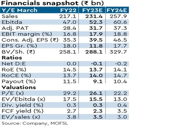 Dupont analysis indicates 410bp improvement in ROE to 14.5% in FY22. This was primarily led by better asset turn and considerable margin expansion. The Ebitda margin was steady over FY18-20.
