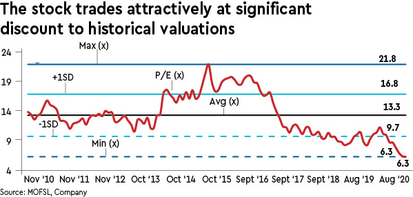 Volumes and e-auction realisations have been under pressure on decline in power demand and significant stocks at both mines and power plants. However, power demand is showing signs of improvement and we expect volumes to recover in H2FY21. Furthermore, we expect Coal India to tide over the current situation given its large cash position. The stock trades attractively at ~1.6x FY22e EV/adj. Ebitda (v/s historical average of 7x), P/E of 5x (v/s average of ~13x) and offers a dividend yield of ~10%.