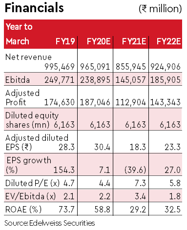 Besides, the company is reducing production at its high-cost mines in order to rationalise the fixed cost. In our view, FY21 is likely to be challenging with volumes dropping to mere ~535mt and Ebitda plunging 39% y-o-y to Rs145 bn.