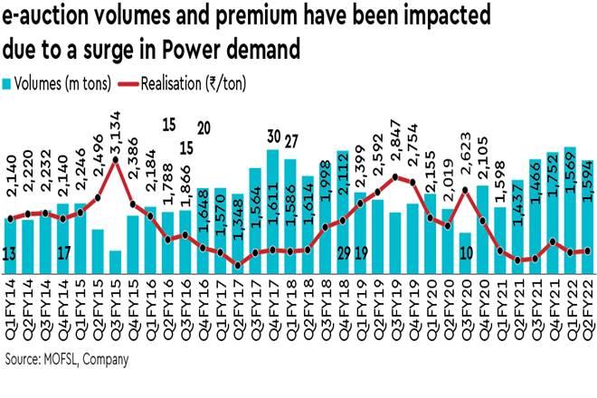 Our FY22 e-auction ASP at `1,650 is conservative, considering Q2 e-auction ASP of Rs 1,594/t (a 15.3% premium over FSA prices), while the current premium over FSA is ~50%. We see scope for an upward revision to our FY22 estimate, if current e-auction premiums sustain, provided volumes pick up.