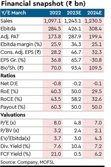 Coal India trades at 3.0x/4.3x our FY23/24E EV/Adj. Ebitda. We expect a 10% dividend yield at current market price, as we forecast strong earnings to result in healthy dividends going forward. We raise our FY23/24E Adj. Ebitda by 6%/2%, respectively, and increase our TP to Rs 290 (from Rs 275), premised on 4x FY23E EV/Ebitda. Maintain Buy.