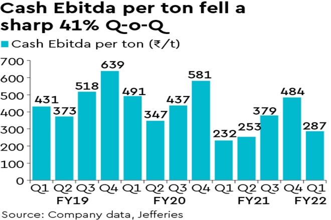 Ebitda miss in Q1: COAL’s Q1 dispatch volumes were 5% above Q1FY20 but ASPs were 4% lower due to weaker e-auction realisations. Reported Ebitda was 27% below Q1FY20. Excluding the non-cash stripping-activity-adjustment expense, cash Ebitda was 39% below Q1FY20. Cash cost/t rose 14% vs Q1FY20 while cash Ebitda/t was 42% lower. FSA volumes were down 4% q-o-q while FSA ASP were flattish q-o-q. Q1 e-auction volumes grew 4% q-o-q while e-auction ASP declined 10% q-o-q. Q1 PAT was down 31% q-o-q (32% below Q1FY20).