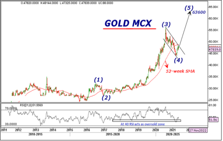 Thus, we view that wave (4) has terminated at 44108. However, the conviction would be higher if prices break above the channel and its 52-week SMA at 49000 levels. This breakout of 49000 levels would indicate that primary wave (5) is in progress and its measuring implication as per Fibonacci guideline depicts a rally towards 54500 then 63600 zones. Alternatively, a fall below 44100 would negate our bullish view.
