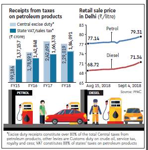 Both the Centre and states collect huge amounts as taxes from petroleum items. While the Centre collected `2.84 lakh crore from assorted taxes on the crude oil and petroleum products in FY18, 80% of it came from the excise duties on petrol and diesel alone. Through their taxes (VAT/sales tax/octroi, etc), state governments collected another `2.09 lakh crore from petroleum products in FY18.